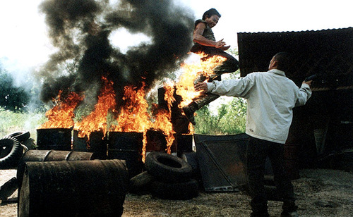 Tony Jaa is one crazy bastard. His breakthrough film Ong Bak is still his best. The way the movie builds up (hardly anything happens for around 30 minutes) to the first fight scene is spectacular. But the real meat on the bone here are the madfuck stunts that Jaa performs throughout the movie. The center piece chase sequence is simply astounding, but it’s not necessarily a fight scene per se. My favourite fight in the movie is definitely this sequence. With his legs filled with lighter fluid and outnumbered, Jaa takes on the option of setting his own legs on fire and knee-kicking everyone in the face/chest/crotch/back etc.