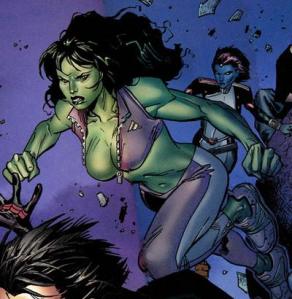 She-Hulk is Jennifer Walters, cousin of Bruce Banner (the original Hulk). Exposed to the same gamma radiation that affected her cousin, Walter is transformed into She-Hulk, giving her superhuman strength and endurance as well as other abilities that include regenerative healing, and the ability to power switch.