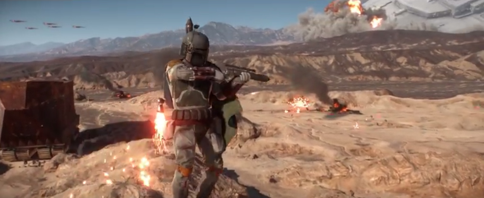 The above image is taken from The Battle of Jakku, and features Boba Fett in all his jet-packed, badass glory. Note the plummeting Star Destroyer in the top right corner. That’s the exact same Star Destroyer in this image…